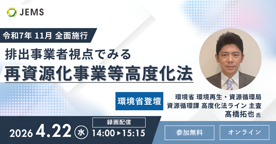 株式会社JEMSはこのたび、「再資源化事業等高度化法」をテーマに、無料オンラインセミナーを開催します。