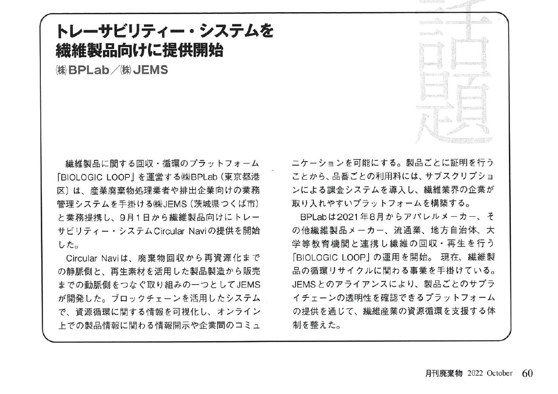 2022/10/05 月刊廃棄物に「Circular Navi」の記事が掲載されました 2022年10月05日発行の月刊廃棄物(発行元:日報ビジネス株式会社)に弊社と株式会社BPLabとの業務提携について掲載されました。 ※クリックで拡大できます 関連ページ資源循環の価値証明サービス「Circular Navi」 < 前の記事 次の記事 >