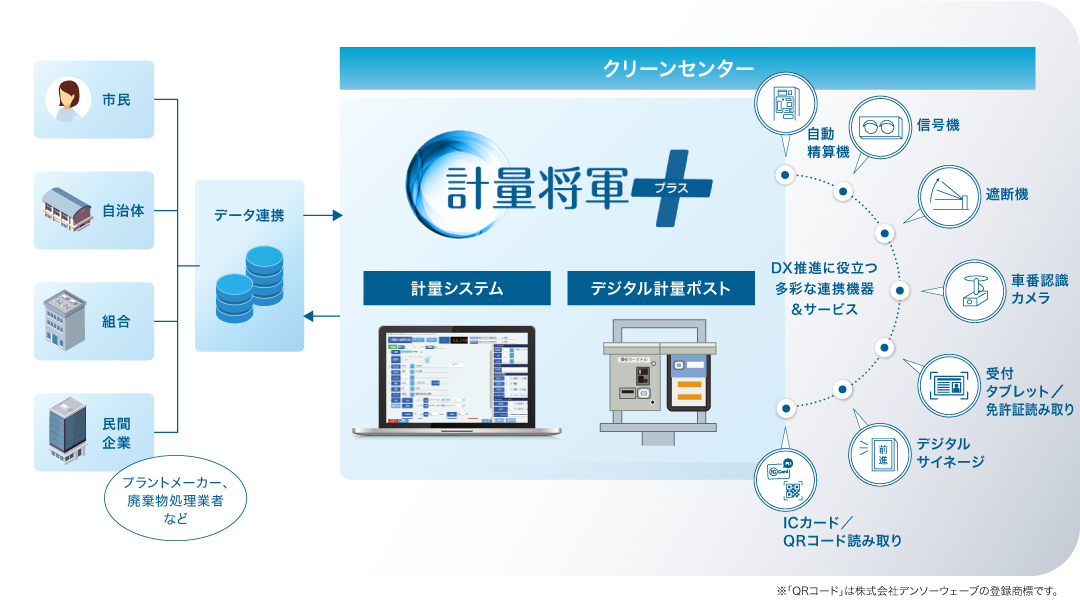 計量システムと計量ポスト(連携含む)です。 オプションとして、車番認識カメラや入退場ゲートといった場内の機器までご提供可能です。